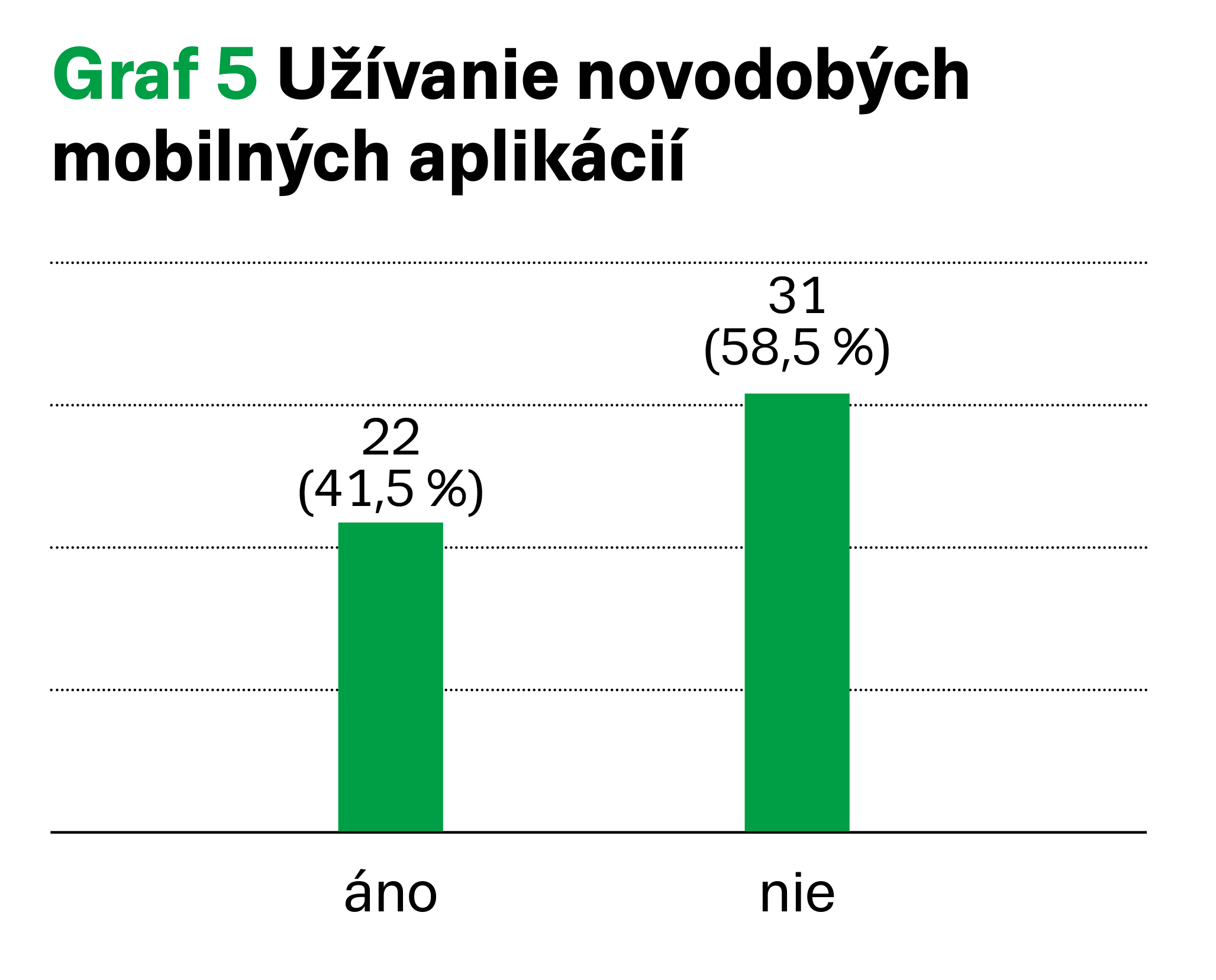 Užívanie novodobých mobilných aplikácií je uvedené v grafu 5. V tejto otázke sme zisťovali užívanie novodobých mobilných aplikácií dostupných na slovenskom trhu. Respondenti mali na výber z možností áno alebo nie. Zistili sme, že až 22 (41,50 %) rodičov využíva dostupné aplikácie na zaznamenávanie hodnôt glykémie, ktoré im pomáhajú odkontrolovať glykémiu ale aj podávané jednotky inzulínu. O niečo menej respondentov je verných klasickému zaznamenávaniu do diabetického denníka, 31 (58,50 %) respondentov.
