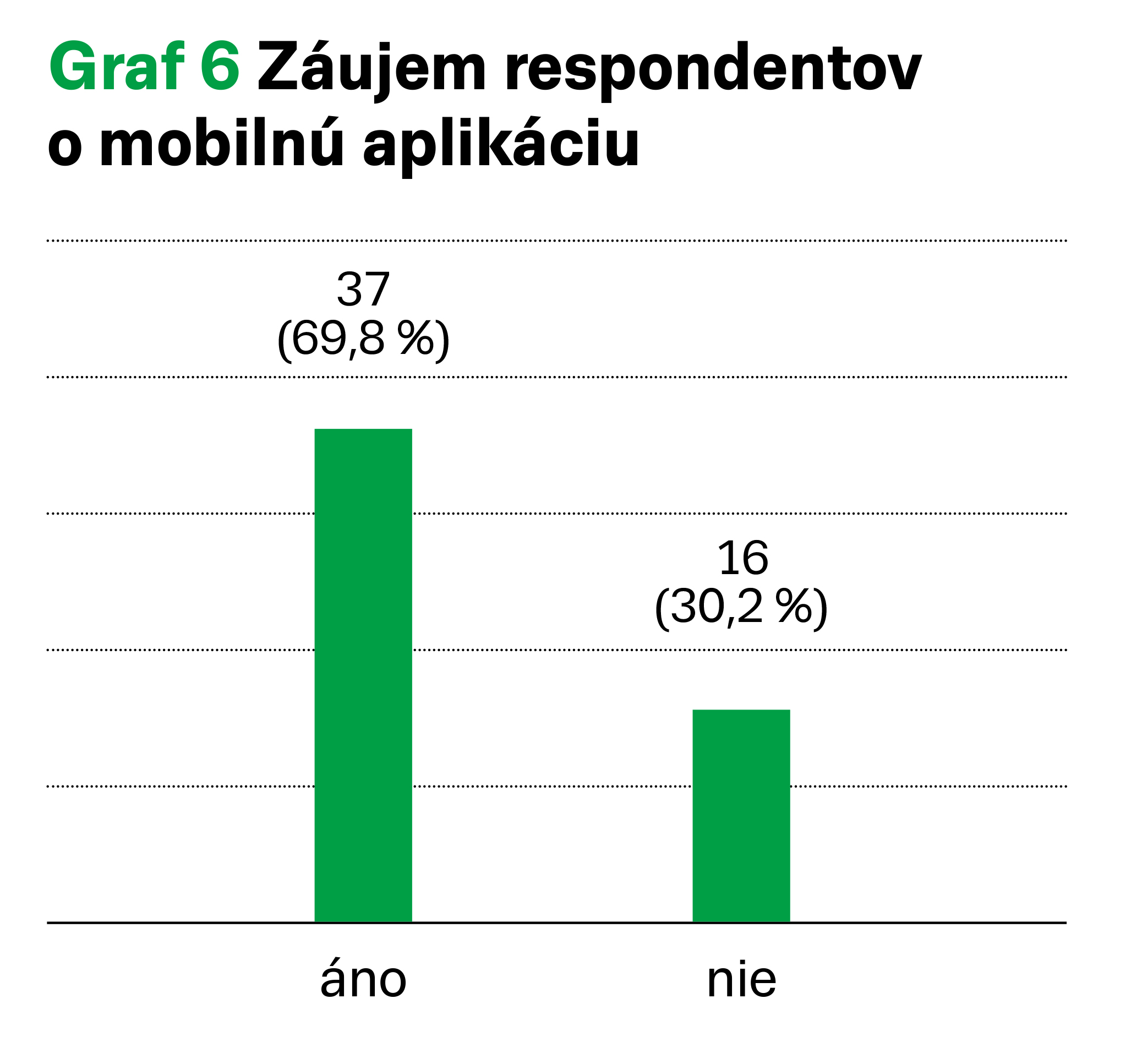 Graf 6 ukazuje záujem respondentov o mobilnú aplikáciu. Chceli sme zistiť, či by rodičia mali záujem o používanie mobilnej aplikácie. Respondenti mali na výber z odpovedí áno alebo nie. Odpoveď áno zvolilo 37 (69,8 %) respondentov, 16 respondentov zvolilo odpoveď nie a to z dôvodu, že ich dieťa používa rôzne doplnkové funkcie od výrobcov inzulínových púmp, senzorov.