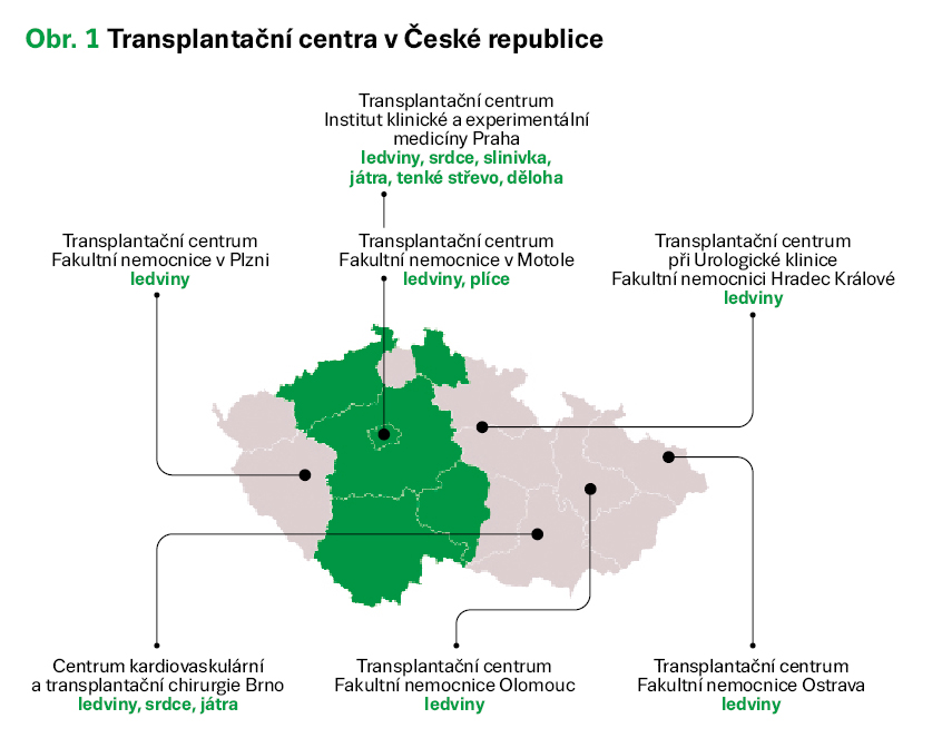 V České republice působí sedm transplantačních center (TC) s vymezeným regionem dárcovských nemocnic (obr. 1). Každé centrum má své koordinátory, kteří jsou spojovacím článkem mezi dárcovskou nemocnicí a TC. Největší TC je Institut klinické a experimentální medicíny (IKEM) v Praze, kde se provádí transplantace srdce, jater, ledvin, slinivky břišní, Langerhansových ostrůvků, dělohy, transplantace tenkého střeva a cév.