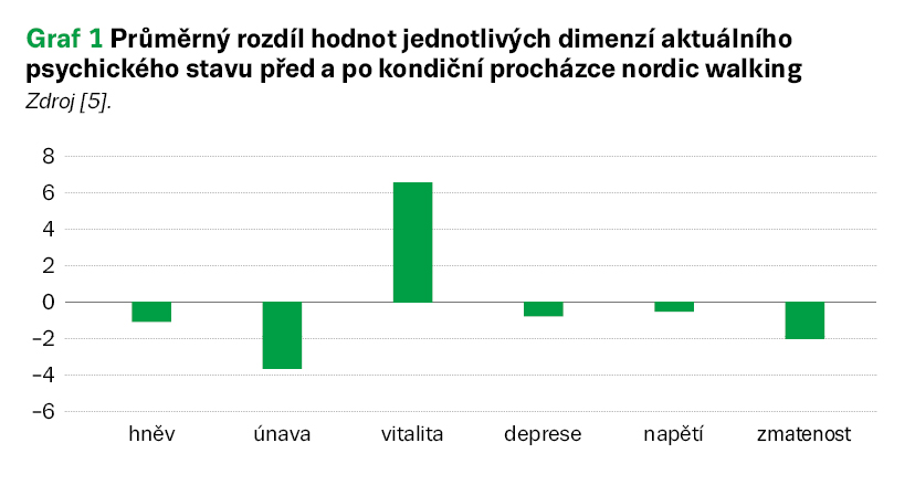 Pozitivní vliv terénních kúr v lesním prostředí na psychický stav a zlepšení nálady lázeňských hostů potvrzují i výsledky standardizovaného dotazníkového šetření Institutu lázeňství a balneologie, v. v. i. Byla potvrzena hypotéza, že existuje statisticky významný rozdíl ve všech dimenzích (napětí, deprese, hněv, vitalita, únava a zmatenost) dotazníku Profile of Mood States před kondiční procházkou nordic walking v lázeňských lesích Karlových Varů a po ní. U zúčastněných probandů došlo k významným změnám jednotlivých dimenzí aktuálního psychického stavu. Snížila se hladina napětí, deprese, únavy, hněvu, zmatku a zvýšila se vitalita (graf 1). Největší změna po absolvování lázeňského pobytu byla dle hodnot mediánů a průměrů pozorována v oblasti vitality (Huseynli, Marková, 2021). Další významná změna ve smyslu snížení nastala v oblasti únavy. Únava je přirozenou reakcí organizmu na vyčerpání zásob energie ve svalových a nervových buňkách (Nakonečný, 2000). Únava, která trvá déle než několik dní, v případě, že neodpovídá vynakládané námaze, může být projevem onemocnění nebo poruchy organizmu. Tendence podceňovat signály únavy může mít fatální následky.