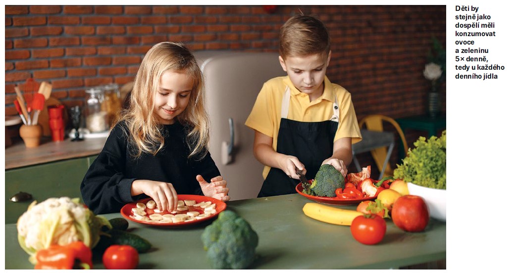 Děti by stejně jako dospělí měli konzumovat ovoce a zeleninu 5× denně, tedy u každého denního jídla. Lišit se bude jen velikost porce. Dbáme přitom na co největší pestrost a preferujeme lokální a sezónní zdroje.