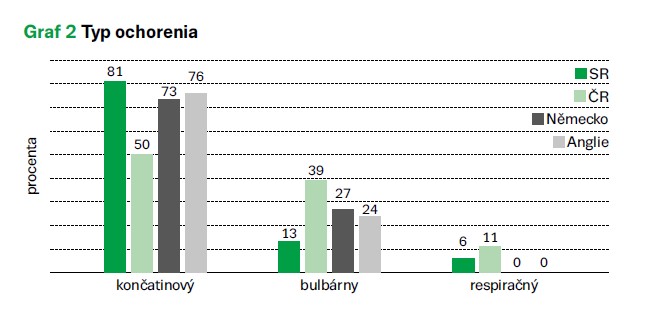 V ďalšej výskumnej hypotéze sme očakávali, že bude existovať významný rozdiel v celkovom prežívaní kvality a typom ochorenia. Opätovnou aplikáciou testu rozkladu rozptylu ANOVA so závislou premennou celkovou kvalitou života a nezávislou premennou typom ALS sa potvrdila signifikantnosť závislosti p = 0,027. Keďže rozdiely sa stali štatisticky významné, overovali sme, ktoré kategórie sa vzájomne signifikantne líšia. Komparácia údajov poukázala na zistenie, že najväčší rozdiel v celkovej kvalite života pacientov zo všetkých krajín sa prejavil v porovnaní údajov od pacientov s bulbárnym a respiračným typom ALS.