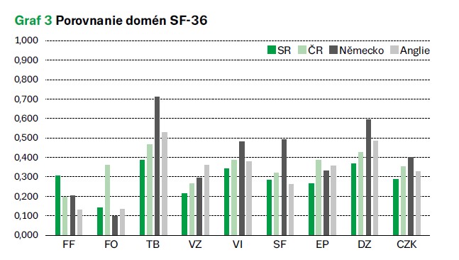 Z hľadiska hodnotenia celkovej kvality života a jej porovnaním respondentov podľa krajín pôvodu sme zistili, že neexistujú štatisticky významné rozdiely v jej prežívaní. Tvrdenie je podporené i výsledkom testu rozkladu rozptylu ANOVA p = 0,436 pri stanovenej hladine významnosti p < 0,05. Signifikantným zistením bola preukázaná korelácia medzi celkovou kvalitou a výsledkom Barthelovej indexu. Hodnota p z testu rozkladu rozptylu ANOVA bola p = 0,009. Nakoľko predpokladaná závislosť bola štatisticky významná, testovali sme aj lineárny kontrast, v ktorom sme predpokladali, že vyššie hodnoty Barthelovej indexu budú kladne korelovať s vyššou hodnotou celkovej kvality života (hodnota 5 v dotazníku SF-36 znamenala negatívne hodnotenie). Štatistická signifikantnosť sa rovnala 0,025, čím sa daný predpoklad potvrdil. Výsledky sa stotožňujú so zisteniami Kőrnerovej et al. (2015) i Sandstedta et al. (2016), ktorí v rámci svojich štúdií dospeli k záverom, že pacienti s ALS pociťovali najvýraznejšie zhoršenie kvality života v rámci fyzickej oblasti, fyzického fungovania. Poukázali i na pozitívnu koreláciu medzi depresiou a kvalitou života. ALS podľa nich výrazne ovplyvňuje fyzickú doménu, fyzické zdravie, ale zasahuje aj do psychosociálnej oblasti života. S uvedeným zistením sa stotožňujeme, nakoľko z grafu 3 je zjavné, že pacienti zaradení do nášho výskumu uviedli značný negatívny vplyv choroby i na oblasť duševného zdravia.