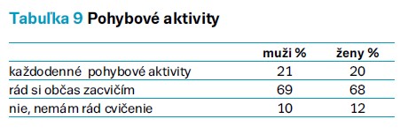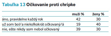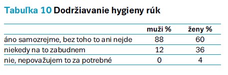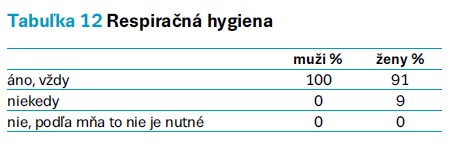 Každodenné pohybové aktivity vykonáva 20 % respondentov, len 11 % respondentov necvičí, lebo nemá rád šport (tab. 9). Veľmi dôležitým preventívnym opatrením proti chrípke je umývanie rúk. Až 64 % respondentov uviedlo, že samozrejme dbá na hygienu rúk. Celkom 4 % respondentov to vôbec nepovažujú za potrebné, čo je veľkou chybou. Niekedy umývanie rúk zabudne 32 % respondentov (tab. 10). Aspoň 2 hodiny vonku na čerstvom vzduchu (vzhľadom na ich zdravotný stav a počasie) trávi až 49 % respondentov. Iba 5 % respondentov (všetko ženy) neradi a veľmi zriedka chodí vonku a veľmi málo. Celkom 46 % respondentov uvádza, že chodí na čerstvý vzduch iba vtedy, ak to považuje za potrebné (tab. 11). Až 92 % respondentov uviedlo, že si za každým kýchnutím, či zakašľaním dáva ruku na ústa. Iba 8 % respondentov si ruku na ústa dáva len niekedy (tab. 12). Už niekoľkokrát bolo očkovaných 37 % respondentov a 32 % respondentov ešte nikdy nebolo očkovaných proti chrípke. Pravidelne každý rok sa dáva očkovať 31 % opýtaných (tab. 13).
