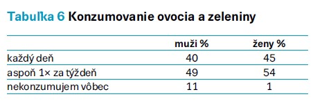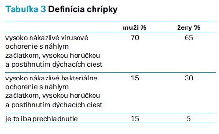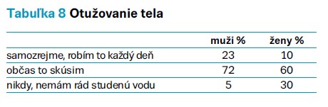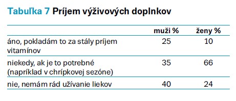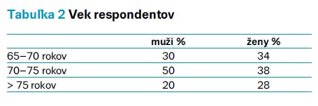 Do prieskumu sa zapojilo 80 respondentov, z toho 10 mužov (12 %) a 70 žien (88 %) (tab. 1). Vekové zastúpenie v kategórii 65–70 let bolo 30 % mužov a 34 % žien. V kategórii 70–75 let bolo zastúpenie 50 % mužov a 38 % žien, v kategórii > 75 rokov bolo 20 % mužov a 28 % žien (tab. 2). Až 66 % respondentov odpovedalo, že chrípka je vysoko nákazlivé vírusové ochorenie s náhlym začiatkom, vysokou horúčkou a postihnutím dýchacích ciest. Celkom 29 % respondentov odpovedalo, že je to bakteriálne ochorenie (tab. 3). Až 100 % respondentov udáva prenos chrípky kvapôčkovou infekciou – kašľom, kýchaním, blízkym kontaktom alebo rozhovorom s chorými (tab. 4). Až 75 % respondentov uviedlo, že inkubačná doba chrípky je niekoľko hodín. Iba 25 % opýtaných uviedlo, že ochorenie sa prejaví najskôr po týždni od prenosu nákazy (tab. 5). Ovocie a zeleninu aspoň 1× za týždeň konzumuje až 55 % respondentov. Každý deň konzumuje zeleninu 45 % respondentov (tab. 6). Výživové doplnky užíva až 63 % respondentov. Celkom 25 % opýtaných ich považuje za lieky a uvádza, že nemá rád užívanie liekov (tab. 7). Veľmi zdravé je otužovanie studenou vodou a občas to skúsi až 61 % respondentov. Každý deň sa otužuje len 11 % respondentov. Celkom 28 % respondentov nikdy neotužovalo, nemá rád studenú vodu (tab. 8). Až 69 % respondentov uviedlo, že si radi občas zacvičia (primerane k ich veku).