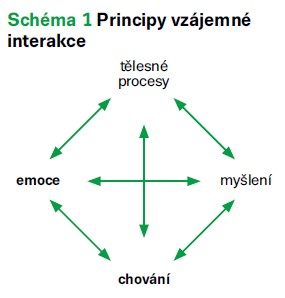 Principy vzájemné interakce mezi tělesnými procesy, emocemi, myšlením a chováním shrnuje schéma 1.