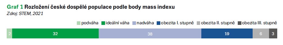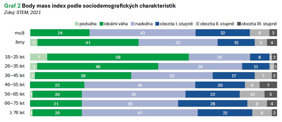 Výzkum agentury STEM publikovaný v únoru 2021 ukázal nejnovější data v České republice. Normální hmotnost má jen 32 % české dospělé populace, což je alarmující. Většina obyvatel ČR vykazuje v tomto výzkumu nadváhu (38 %) nebo obezitu (28 %), podváhou trpí jen 2 % veřejnosti (graf 1). Podíl žen s normální hmotností (41 %) je téměř dvojnásobný oproti podílu mužů s ideální hmotností (24 %). Zároveň téměř jen mezi ženami najdeme ty, kteří vykazují podváhu (graf 2). I tak má 32 % žen v ČR nadváhu (body mass index (BMI) 25–30 kg/m2) a 24 % žen můžeme označit jako obézní (BMI > 30 kg/m2). Do 45 let postupně výrazně klesá podíl normálně vážících osob, od 46 let zůstává již téměř stálý. S věkem naopak postupně roste podíl obézních, pouze u nejstarší věkové skupiny pak klesá (graf 2).