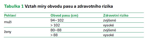 Při každé preventivní prohlídce by měl být stanoven BMI, změřen obvod pasu, eventuálně podíl tuku v těle a pacient by měl být poučen o míře nadváhy či obezity a o hrozících zdravotních komplikacích. Nejjednodušší metodou je měření obvodu pasu. Je to metoda rychlá a velmi přínosná pro předpoklad zdravotních rizik obezity. Za normu je považována míra v pase u žen do 80 cm a u mužů do 94 cm. U hodnot nad 88 cm u žen, respektive nad 102 cm u mužů je již nutné pacienta poučit o zdravotních rizicích zvýšené kumulace intraabdominálního tuku (tab. 1).