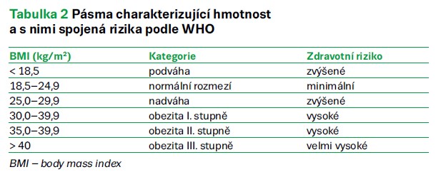 Každý pacient by měl znát svůj BMI. Vypočte se jako hmotnost v kilogramech děleno výška v metrech na druhou, tedy kg/m2. S vyšším BMI korelují vzrůstající zdravotní rizika (tab. 2).