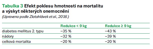 Obézní pacient má často přehnané představy o své cílové hmotnosti a o výši hmotnostního úbytku. Vždy se pacienta ptáme, co je jeho cílem. Někdy se jedná o zlepšení zdravotního stavu. Často bývá cílem vyšší mobilita. Motivací může být i blížící se operace, před kterou pacient musí zredukovat svoji nadváhu. Zejména ženy usilují o nový vzhled a menší konfekční velikost oblečení. Nezřídka vyjadřují svůj cíl redukce v číslech. Bohužel v drtivé většině lékař ihned ví, že se jedná o cíl nereálný. Pak je třeba přesvědčit o tom pacientky, aby nebyly zklamány z nereálného očekávání. Vhodný je například dotaz: „Kdy naposledy jste měla tuto hmotnost a dovedla ji dlouhodobě udržovat?“ Nezřídka padne odpověď: „Před 20 lety,“ nebo dokonce „V dětství“. Z odpovědi pocítí nereálnost svého přání i pacientka. Z lékařského pohledu je vhodně stanovený první cíl minus 10 % současné hmotnosti. Při tomto hmotnostním úbytku již zaznamenáváme pozitivní vliv na hypertenzi, diabetes, dyslipidemii a další komorbidity obezity (tab. 3).