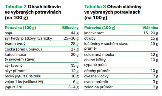 Zdůrazňujeme současně příjem vlákniny, která snižuje energetickou denzitu stravy a rovněž zvyšuje pocit nasycení. K naplnění doporučovaného denního příjmu vlákniny, který činí u dospělého člověka 28–30 g na den, nestačí jen konzumace ovoce a zeleniny, do jídelníčku je nezbytné zařadit i jiné zdroje vlákniny jako například ořechy, semínka, ovesné vločky, luštěniny, celozrnné obiloviny a jiné celozrnné potraviny. Ty obsahují více vlákniny než zmiňovaná zelenina a ovoce (Hainer, 2021) (tab. 3).