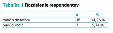 Pri realizácií prieskumu bolo vyplnených 122 dotazníkov, ktoré vyplnilo 122 respondentov (100 %), z toho 115 respondentov (94,26 %) boli rodičia už narodených detí a 7 respondentov (5,74 %) boli budúci rodičia (tab. 1).