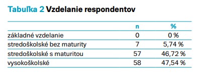V rámci zisťovania dosiahnutého vzdelania – 58 respondentov (47,54 %) malo vysokoškolské vzdelanie, 57 (46,72 %) respondentov dosiahlo stredoškolské vzdelanie s maturitou, 7 (5,74 %) respondenti mali stredoškolské vzdelanie bez maturity a 0 respondentov bolo so základným vzdelaním (tab. 2).