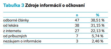 Celkom 47 respondentov (38,51 %) odpovedalo, že informácie získavajú z odborných článkov, 38 respondentov (31,15 %) má informácie o očkovaní od lekára. Celkom 27 respondentov (22,13 %) uviedlo, že informácie si zisťujú z internetu, 7 respondentov (5,74 %) má informácie od priateľov, rodiny a iba 3 respondenti (2,46 %) sa o očkovanie vôbec nezaujímajú (tab. 4).