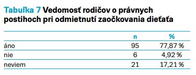 Vedomosť rodičov o právnych následkov pri odmietnutí zaočkovania dieťaťa