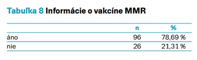 Nepopierateľným faktom je, že očkovanie je veľmi účinným nástrojom na znižovanie počtu infekčných ochorení v dnešnej populácií. Napriek tomu sú hlasy, ktoré túto skutočnosť popierajú a ovplyvňujú tým názory verejnosti. Našim cieľom bolo zistiť, aké informácie majú respondenti o očkovaní. Z prieskumu vyplýva, že 96 respondentov (78,69 %) má vedomosť o vakcíne MMR – uviedli, že je to očkovanie proti ochoreniam morbilli (osýpky), mumps (príušnice) a rubeola (ružienka). Iba 26 respondentov (21,31 %) nevedelo uviesť o aký typ očkovania ide.