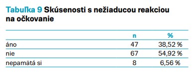 Skúsenosti s nežiaducou reakciou na očkovanie uviedlo 47 respondentov (38,52 %), 67 respondentov (54,92 %) nemalo doposiaľ negatívnu skúsenosť s očkovaním a 8 respondentov (6,56 %) si nepamätalo výskyt nežiaducej reakcie na očkovanie (tab. 8).