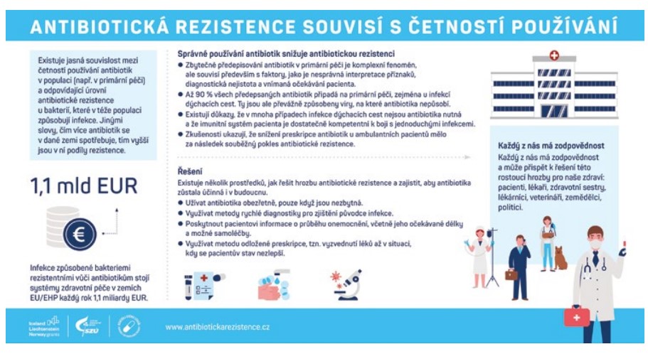 „I u nás se již setkáváme s bakteriemi, které jsou natolik odolné, že léčba infekcí, které vyvolávají, je obtížná či dokonce zcela nemožná. Hlavními patogeny v rámci České republiky jsou Klebsiella pneumoniae a Pseudomonas aeruginosa, během pandemie covidu-19 vzrostla rezistence i u dalších nemocničních patogenů, například Acinetobacter baumannii,“ říká doc. MUDr. Helena Žemličková, Ph.D., vedoucí Národní referenční laboratoře pro antibiotika. „Špatnou zprávou je, že rezistentní bakterie způsobují infekce takzvaně navíc. Absolutní počet případů infekcí obvykle stoupá i spolu s narůstající rezistencí. Přitom více než polovina určitých infekcí spojených se zdravotní péčí se považuje za infekce, kterým lze předcházet.“