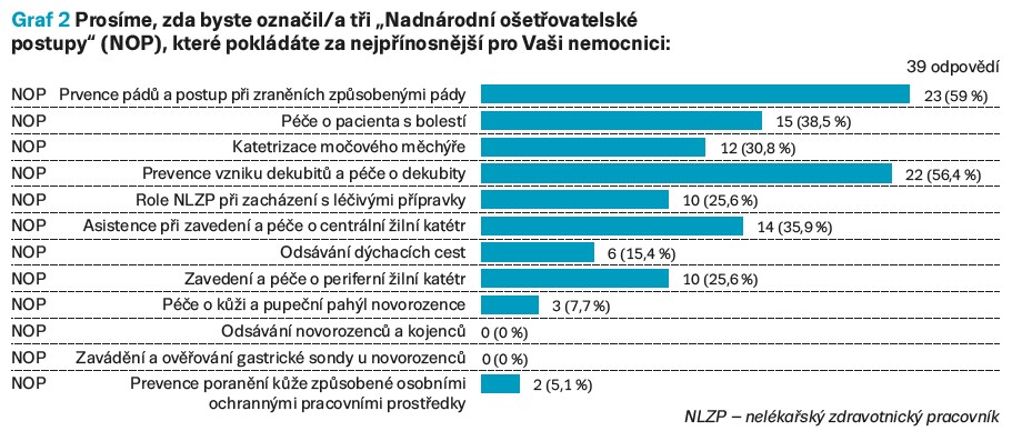 Z žádosti „Prosíme, zda byste označil/la tři NOP, které považujete za nejpřínosnější pro vaši nemocnici“, jsme získali následující přehled (graf 2). Na prvních šesti místech jsou tyto postupy: