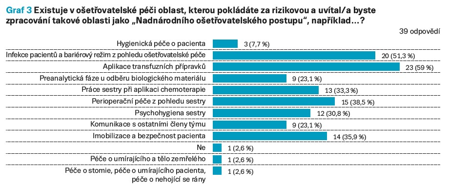 Na otázku, zda existuje v ošetřovatelské péči oblast, kterou pokládáte za rizikovou a uvítal/la byste zpracování takové oblasti jako NOP, odpovídali respondenti následovně (graf 3). Na prvních šesti místech jsme identifikovali tyto oblasti: