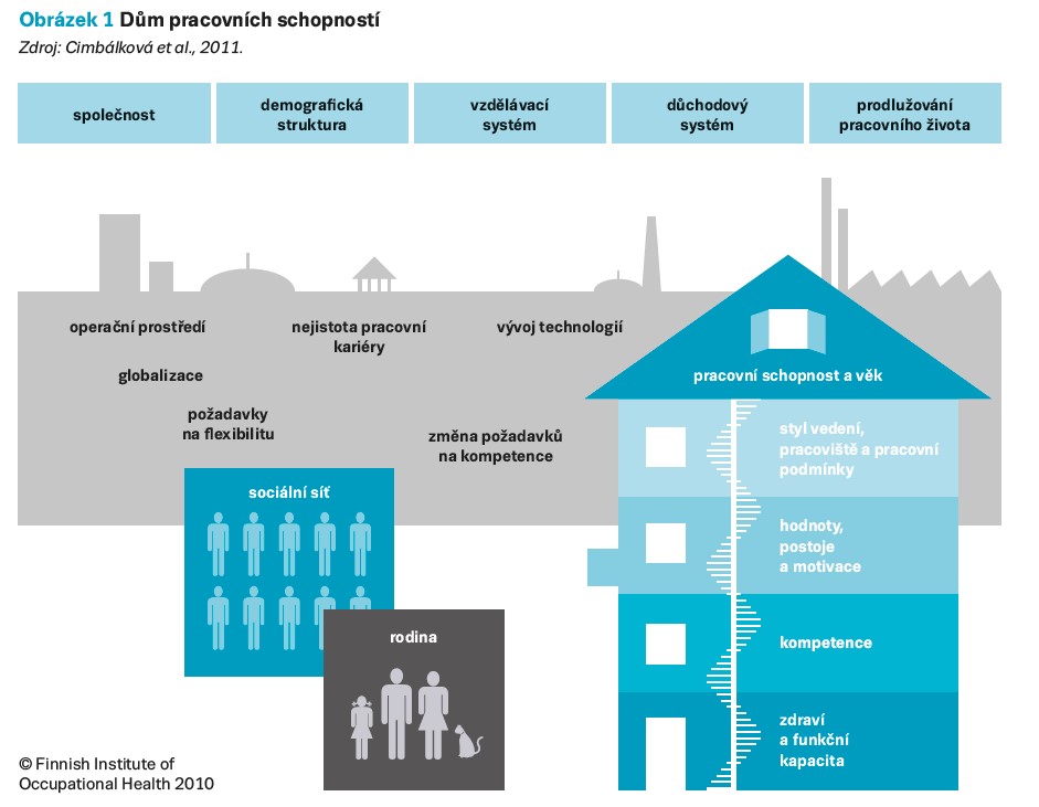 Pracovní trh musí čelit věkovým změnám ve společnosti spojeným se stárnutím populace, s odchodem do důchodu a možnostmi podpory faktorů pracovní schopnosti. V této oblasti se i v České republice prosazuje takzvaný age management, který se zabývá způsobem řízení zaměstnanců s ohledem na jejich věk. Již v 80. letech 20. století se problematikou stárnutí zaměstnanců začali zabývat ve Finsku. Profesor Juhani Ilmarinen se svým týmem pracovníků z Finského institutu pracovního zdraví (FIOH) realizoval longitudinální studii s cílem zmapovat změny ve stárnutí a jejich dopad na schopnost pracovat a dle toho nastavit hranici odchodu do důchodu (ve Finsku aktuálně 65 let). U 6 500 osob nad 45 let pracujících ve státní sféře hodnotili sedm oblastí, zejména zdravotní stav a funkční kapacitu jedince, ale také vliv pracovního stresu a prostředí. Výsledky ukázaly vzájemnou provázanost mezi organizací práce, ergonomií pracoviště a individuálním životním stylem a nastavením jedince. Analýza byla realizována pomocí nově sestavené metody Work Ability Index (WAI – index pracovní schopnosti), která umožňuje zhodnotit soulad mezi pracovními nároky a individuálními zdroji jedince. Metoda byla úspěšně implementována ve více než 30 zemích. Napříč jednotlivými státy byly identifikovány faktory související se špatnou pracovní schopností: pokles vitální fyzické aktivity, špatná muskuloskeletální kapacita (bolesti zad, snížená funkčnost zad, krku -anebo končetin), obezita, vysoké požadavky na duševní práci, nedostatek volného času, nedostatek autonomního rozhodování, špatné pracovní prostředí a vysoká fyzická pracovní zátěž. Výsledkem bylo vypracování takzvaného domu pracovních schopností, který zohledňuje základní a související činitele, které ovlivňují výkon zaměstnance v jakémkoli věku. Pro dobrou pracovní schopnost musí být v rovnováze osobní zdroje zaměstnance, jako jsou zdraví, funkční kapacita, motivace, hodnoty, postoje, a požadavky pracovního prostředí, jako jsou forma a obsah vykonané práce, organizace práce, pracovní prostředí, sociální vztahy na pracovišti a způsob řízení. Jednotlivá patra domu jsou vzájemně propojena schodištěm. Související faktory, jako jsou rodina, sociální sítě, operační prostředí, společnost a vývoj v zemi, podpoří, nebo naopak devalvují pracovní schopnost jedince (obr. 1).