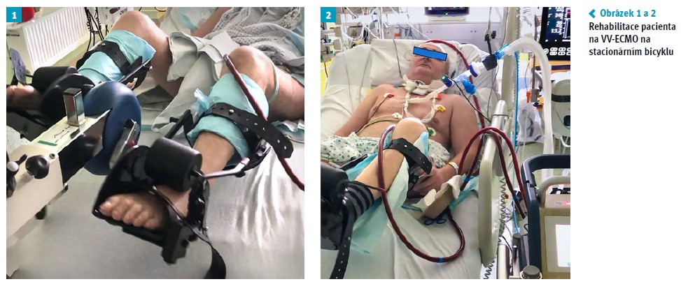 Z počátku u nemocného dominuje těžká polyneuropatie a myopatie kriticky nemocných, bez lateralizace. Od dubna 2021 pacient začíná postupně rehabilitovat. Rehabilitace je samozřejmě limitována zavedenými ECMO kanylami a probíhá zejména vleže a v semirekumbentní poloze. Jelikož je z počátku u nemocného horší koordinace pohybů a jemné motoriky horních končetin, zařazujeme také ergoterapii. Nemocný se dále potýká s intenčním třesem a zvýšeným pocením („stojící pot na pokožce“), které jsou pravděpodobně způsobeny dlouhodobou terapií anestetiky (1% propofol, midazolam). Tato situace vyžadovala opakované výměny lůžkovin a prádla nemocného, abychom předešli komplikacím, jako je kontaktní dermatitida nebo dekubity. Motorický neklid, související zřejmě s terapií benzodiazepiny a opiáty, byl řešen nasazením neuroleptik. Pro depresivní stavy a občasné změny nálad s plačtivými epizodami byla do terapie zařazena anxiolytika a antidepresiva. Pacient je kromě nejistoty z dalšího osudu deprimován nemožností hodnotné verbální komunikace, neboť nelze z důvodu toalety dýchacích cest pacienta zbavit tracheostomické kanyly. Velký podíl na udržování psychického rozpoložení měl pravidelný kontakt nemocného se svou rodinou, ať už přes videohovory, nebo osobní návštěvou. Na zlepšování pacientovy psychické pohody se podílel také celý okruh personálu – ošetřující zdravotnický personál, ergoterapeuti, fyzioterapeuti, dietní sestra, psychologové, psychiatři, nemocniční kaplanka a po pacientově zařazení na čekací listinu k transplantaci plic také opakované návštěvy lékařů z transplantačního centra. Pokroky nemocného byly zjevné. Na konci prázdnin 2021 byl schopen obsloužit se v rámci lůžka (najedl a napil se sám, hygienu zvládal s pomocí sestry), otevřel si telefon, napsal sms zprávu nebo zavolal, s pomocí sestry se otáčel na boky, byl schopen ujet aktivně několik kilometrů na stacionárním rotopedu s mírnou zátěží (obr. 1 a 2). Pacienta se současně i přes zavedenou tracheostomickou kanylu daří přes úvodní těžkou gastroparézu postupně převést z enterální výživy na perorální příjem. Od května 2021 je plně na perorální stravě kombinované se sippingem.