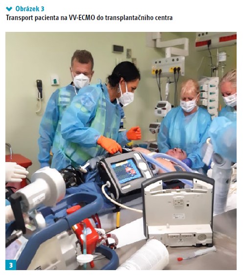 Dne 18. 9. 2021 je nemocný přeložen do transplantačního centra Fakultní nemocnice v Motole (obr. 3). Následující den byla uskutečněna oboustranná transplantace plic. Bezprostřední pooperační průběh je přiměřený, pacient se 24. 9. 2021 po 212 dnech zbavuje ECMO podpory, daří se weaning od umělé plicní ventilace, pro selhání ledvin je nutné přechodné napojení na kontinuální hemodialýzu.