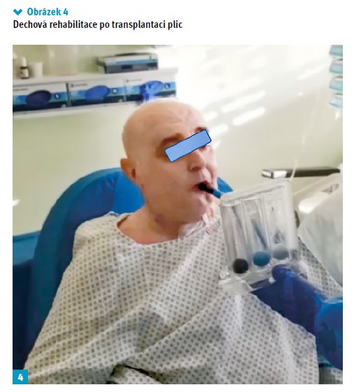 Nemocný se vrací z transplantačního centra na naše oddělení 24. 11. 2021. Je spontánně ventilující, bez nutnosti oxygenoterapie (obr. 4). Echokardiograficky pozorujeme ústup plicní hypertenze a obrazu chronického cor pulmonale. Později se nicméně přidružují komplikace. Ty jsou jednak infekční – opakované infekce dýchacích cest multirezistentní bakteriální flórou, infekce rány v třísle po extrakci ECMO kanyly hojené per secundam, vč. využití podtlakové VAC (vacuum-assisted closure) terapie. Při vertikalizaci je nemocný zprvu limitován equinovarózním postavením nohou s neschopností plantárního došlapu. Tento stav byl zřejmě způsoben dlouhodobou imobilizací nemocného. Po aplikaci progresivních dlah zaznamenáváme mírné zlepšení v postavení dolních končetin. Na začátku prosince 2021 je rehabilitace a mobilizace nemocného komplikována patologickou frakturou krčku levého a o 3 týdny později i krčku pravého femuru. To opět nemocného upoutává na lůžko. Na těžké osteoporóze vedoucí k patologickým frakturám měla zřejmě hlavní podíl imobilita a systémová kortikoterapie, která byla podávána jak v úvodu v rámci léčby syndromu akutní dechové tísně (ARDS – acute respiratory distress syndrome), tak následně jako součást protokolu imunosuprese. Nemocný pokračuje v rehabilitaci na lůžku, je titrována analgetická terapie, nastavena léčba osteoporózy. Přes výrazný pokles motivace, emoční labilitu, frustraci z téměř ročního pobytu v nemocnici vyúsťující v omezenou spolupráci se daří mírný pokrok v rehabilitaci vč. vertikalizace ve vysokém chodítku a pacient je 18. 1. 2022 přeložen na Rehabilitační oddělení Rehabilitační nemocnice Beroun. V březnu 2022 rehabilitační pobyt opět narušuje infekce dýchacích cest a pacient následně 6 měsíců po transplantaci plic umírá na oboustrannou pneumonii.