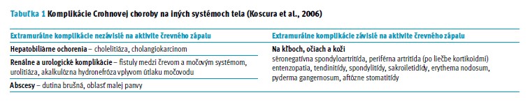 Z vyššie uvedených príznakov je jasné, že CD má veľmi pestrý klinický obraz, čo môže mať za následok neskoré stanovenie správnej diagnózy. Dlhodobé neriešenie stavu býva často príčinou komplikácií, ktoré vznikajú ako v tráviacej trubici, tak aj na iných systémoch ľudského tela. V tab. 1 uvádzame komplikácie nezávislé a závislé na aktivite črevného zápalu.