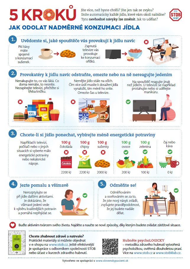V našich kurzech se také snažíme odbourávat černobílé vidění světa typu „Dnes jsem si vzal čokoládu = konec světa“. To není potřeba. Přetváříme myšlení takto: „Dnes jsem si vzal celou čokoládu, nevadí, pro jednou, zítra si tedy vezmu menší porci přílohy nebo nahradím nějakou potravinu méně energeticky bohatou a kalorický nadbytek vyrovnám.“