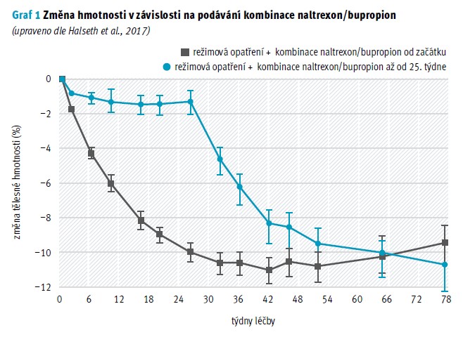 Udávaná průměrná redukce podle studií byla 9,3 % původní hmotnosti (Greig et al., 2015), což zařadilo tento lék na špičku v úspěšnosti v léčbě obezity. V jiné studii (Halseth et al., 2017) byl dosažený výsledek za medikamentózní podpory naltrexon/bupropionem ve 40. týdnu léčby dokonce –11 % (graf 1). Ve všech čtyřech klinických studiích fáze 3 bylo ve srovnání s placebem dosaženo signifikantně většího podílu jedinců, kteří dosáhli ≥ 10% snížení hmotnosti, redukce v obvodu pasu, pozitivní úpravy hodnot triglyceridů, LDL a HDL cholesterolu a signifikantně pozitivní vliv na HbA1c u obézních diabetiků vůči placebu. Signifikantně se snížil i diastolický krevní tlak za nezměněné tepové frekvence.