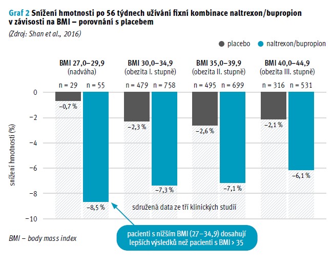 Bylo také naznačeno, že terapie kombinací naltrexon/bupropion je úspěšnější u osob s nižším BMI – je tedy vhodné začít s farmakoterapií co nejdříve a nečekat, až se bude pacient pohybovat ve vyšších stupních obezity (graf 2).