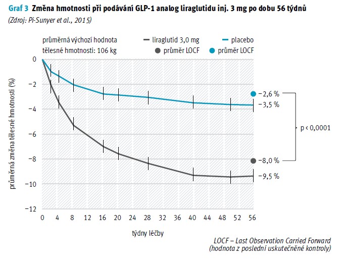 Úspěšnost terapie liraglutidem má být kontrolována po 12 týdnech léčby, kdy očekáváme úbytek hmotnosti ≥ 5 % z původní hmotnosti. Retrospektivní studie z šesti obezitologických center v Kanadě (Wharton et al., 2019) ukázala klinicky i statisticky významný pokles tělesné hmotnosti po 6 měsících léčby o 7,1 %, přičemž 35 % účastníků dosáhlo dokonce 10% snížení hmotnosti. Pokud byl liraglutid 3 mg podáván po dobu 56 týdnů (Pi-Sunyer et al., 2015), byl zaznamenán pokles hmotnosti o 9,2 % (graf 3).