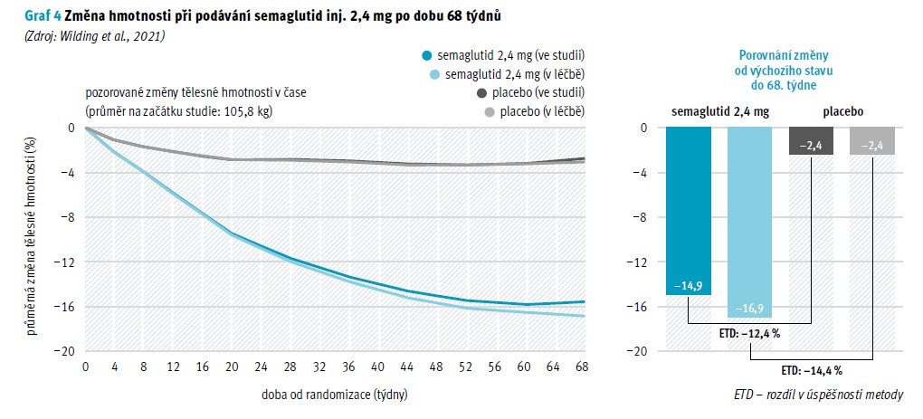Klinické studie pro použití semaglutidu v léčbě obezity (studie STEP 1–5) přinesly ohromující výsledky (Kushner et al., 2020; Singh et al., 2022). Docílená redukce oproti placebu byla 14,9 % vs. 2,9 %. Navíc došlo k signifikantnímu zlepšení kardiometabolických rizik. Použitá dávka semaglutidu byla 1,0 a 2,4 mg při aplikaci 1× týdně s.c. Obdobný pokles byl potvrzen i ve studii Wilding et al. (2021) (graf 4). Po semaglutidu došlo k redukci tělesné hmotnosti o 14,9 %, při aplikaci placeba to bylo 2,4 %. Semaglutid působil účinněji než liraglutid, uplatnil se příznivě i po bariatrických výkonech jako prevence relapsu hmotnostního vzestupu (Murvelashvili et al., 2023). Semaglutid byl zkoušen i u pacientů od 12 let s obezitou (Weghuber et al., 2022), kdy na dávce 2,4 mg 1× týdně zhubli tito pacienti o 16,1 % vs. 0,6 % na placebu.