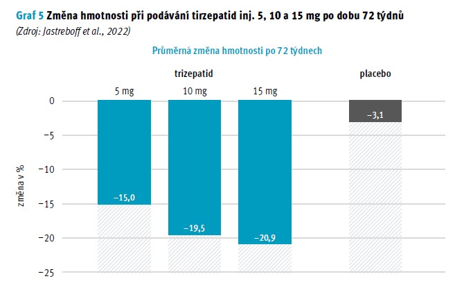 Tirzepatid je první ze zástupců léků na DM2T a obezitu, kdy se bude využívat kombinací agonistů receptorů více hormonů gastrointestinálního traktu. Očekává se větší účinnost a vyšší bezpečnost použití. Tirzepatid je kombinace analogu GLP-1 s analogem GIP (inzulinotropní peptid závislý na glukóze). Tirzepatid opět působí efektem snížení chuti k jídlu a navození brzké sytosti. U pacientů s obezitou probíhají studie SURMOUNT. V první z nich (Jastreboff et al., 2022) byl podáván tirzepatid podkožní injekcí 1× týdně v dávce 5 mg, 10 mg a 15 mg, čemuž odpovídala redukce tělesné hmotnosti o –15 %, –19,5 % a –20,9 % (graf 5). Tyto výsledky se již vyrovnají úbytku hmotnosti po některých bariatrických výkonech. Dále došlo ke zlepšení kardiometabolických rizik a nežádoucí účinky byly mírnější a s raritnějším výskytem než při monoterapii analogy GLP-1.
