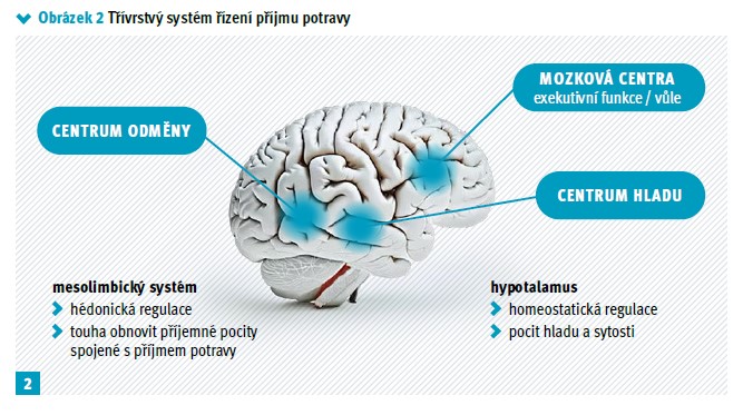 Nad ním existuje druhý neboli hédonický okruh, který je nadřazen okruhu prvnímu. Tento druhý okruh aktivuje jiné části mozku – limbický systém a kůru mozkovou. Jeho činnost je povzbuzována konzumací potravin, které nám chutnají – zpravidla hodně sladkých, tučných či hodně slaných potravin. Prostě takových, které v mozku vyvolají libé pocity a chceme je jíst znovu a znovu a ve větším množství. Můžeme mluvit i o závislosti na nám libém jídle. Jde o aktivaci centra odměny – konzumace těchto potravin není limitována sytostí. Mezolimbický systém v odpovědi na chutné a odměňující potraviny stimuluje jejich příjem, a překonává tak fyziologické homeostatické mechanizmy příjmu potravy. Potrava je vnímána chutí a vůní, klíčovou roli v interpretaci těchto signálů hraje chuťová a čichová dráha. Vzniká emoční propojení, mozek si tento pocit slasti zapamatuje a chce ho opakovat stále častěji. Mnohdy nedokážeme tento okruh vůlí ovládnout. Nepřipomíná vám to onu dříve zmíněnou závislost (obr. 2)?
