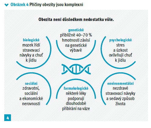 Nesmíme zapomínat ani na vlivy psychologické – přítomnost a míra stresu, úzkost, smutek, radost, to vše ovlivňuje příjem jídla. Navíc často žijeme už od dětství v tzv. obezitogenním prostředí – v rodině, která preferuje nezdravé stravovací návyky, velké porce jídel, sedavý způsob života. To vše nás dále formuje, často negativně (obr. 4).