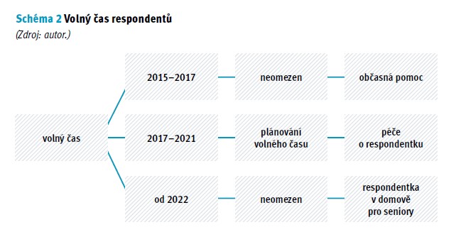 Respondenti museli koordinovat svůj čas pro zajištění stálé péče. Od roku 2021 se nejen respondenti, ale i další členové rodiny intenzivněji zapojili do péče a zůstávali u paní Irmy i přes noc. Dále bylo od této doby nutné zajišťovat veškeré větší nákupy, drobné nákupy obstarávala pečovatelka. Pan Marek zmiňuje pomoc dalších rodinných příslušníků a blízkých paní Irmy při poskytování péče. Od roku 2022 je v domově pro seniory, kde ji respondenti pravidelně navštěvují a tráví s ní čas. Vliv onemocnění paní Irmy na volný čas respondentů je zaznamenán ve schématu 2.