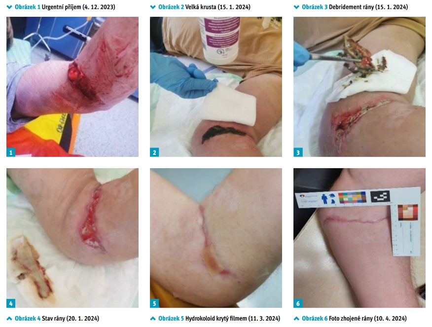 Původně akutní traumatická rána ze dne 4. 12. 2023 se nezhojila standardním postupem per primam a pacient byl přijat 15. 1. 2024 na rehabilitační oddělení s velkou nekrotickou krustou v oblasti kubity levé horní končetiny (LHK). Aby bylo co nejdříve dosaženo pacientova návratu do běžného života cílenou rehabilitací, a byl tak vůbec splněn účel pacientovy hospitalizace na lůžkové rehabilitaci, bylo třeba zaměřit se prioritně na zhojení rány. Léčba nakonec trvala celkem 3 měsíce (obr. 6).