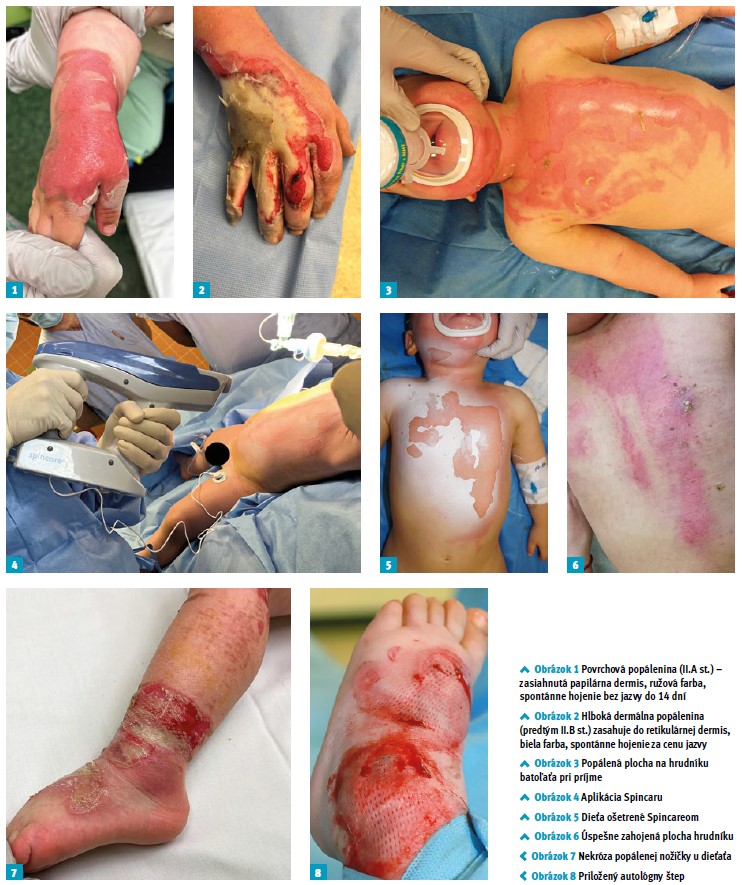 Pri liečbe popálených plôch postupujeme podľa hĺbky zranenia kožného krytu. Pokiaľ je popálená plocha povrchová, používame konzervatívny postup. Pri preväzoch využívame rôzne materiály určené k liečbe popálených plôch ako napr. syntetické kryty vo forme filmov, gélov a pien (Königová et al., 2010). Cieľom starostlivosti o popálené plochy je vytvoriť ideálne prostredie pre proliferáciu a migráciu buniek. Na Klinike popáleninovej medicíny FNKV sa osvedčil Mepilex Ag, ktorý je tvorený kombináciou striebra, mäkkého silikónu a penou s aktívnym uhlím. Jeho hlavná výhoda spočíva v tom, že poskytuje okamžité a širokospektrálne antimikrobiálne krytie, absorpčné vlastnosti a minimálnu bolesť pri preväze, čo má veľmi veľké využitie najmä pri detských pacientoch. Veľké využitie pri povrchových aj hlbokých poraneniach majú biosyntetické kryty, z ktorých využívame napr. Spincare. Najmodernejšou metódou je používanie nanovlákenného materiálu, ktorý aplikujeme priamo na pacientov pomocou metódy Spincare. Vďaka podobnosti nanovlákien s extracelulárnou matrix je táto metóda ideálna pre správne hojenie nie len popálenej plochy, ale využíva sa aj na krytie rán vrátane odberových plôch či chronických defektov. Spincare je prenosné zariadenie, ktoré používa vopred naplnené sterilné ampulky, ktoré obsahujú biokompatibilnú a biologicky odbúrateľnú liečivú látku v tekutej forme, ktorá sa pomocou -elektrického prúdu pri nanášaní na pacienta splieta do nanovlákien. Tento nanovláknový obväz pôsobí ako dočasná epidermálna náhrada, kým povrchový defekt úplne reepitelizuje. Jeho veľkou výhodou je, že predstavuje pre každého pacienta obväz na mieru, je elastický, má bariérovú funkciu a pevne drží na spodine rany. Vďaka týmto výhodám je zabezpečené -optimálne hojenie rany (Šuca et al., 2024) (obr. 3–6).