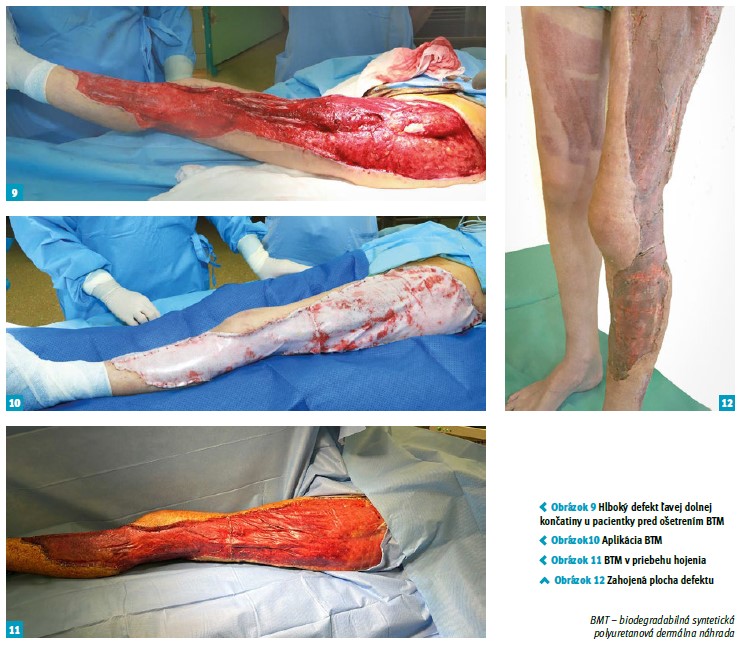 V posledných rokoch majú významné využitie aj syntetické dermálne náhrady, ktoré postupne vytláčajú štandardne používané biologické náhrady (napr. Integra, Matriderm). Novosorb BTM je nová a moderná biodegradabilná syntetická polyuretanová dermálna náhrada, ktorú sme nedávno začali používať aj na našej klinike. Podobne ako do iných náhrad aj do BTM vzrastajú cievy a fibroblasty, ktoré syntetizujú novú dermis. Takto vytvorená neodermis sa následne musí prekryť tenkým autológnym štepom pacienta. Novosorb BTM vykazuje navyše výbornú odolnosť voči bakteriálnej infekcii, neobsahuje žiadny biologický materiál a tým eliminuje aj akékoľvek riziko vzniku medzidruhovej reziduálnej antigenicity, a tak ponúka nový prístup v liečbe hlbokých kožných defektov (Šuca et al., 2024) (obr. 9–12).