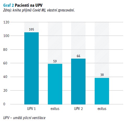 Z prvního sloupce v grafu 2 vyplývá, že z 246 pacientů bylo 42,6 % (105) pacientů napojeno na UPV. Z pacientů připojených na UPV zemřelo 56,2 % (59), viz druhý sloupec. Z úspěšné léčby na UPV se ze 46 pacientů převedlo 52 % (24) pacientů na HFNC terapii. Ze zbývajících 48 % (22) pacientů bylo 23 % (5) pacientů přeloženo na UPV na RES oddělení, kde 80 % (4) z nich následně zemřelo. Celkem jeden pacient zemřel na Covid MJ JIP na jiném druhu oxygenoterapie a zbývajících 73 % (16) pacientů bylo přeloženo na jiná oddělení na konvenční oxygenoterapii nebo bez O2. Z 24 pacientů, kteří byli po úspěšné extubaci napojeni na HFNC terapii, celkem u 21 % (5) HFNC terapie selhala a museli být znovu převedeni na UPV. Z pěti pacientů následně 60 % (3) zemřelo na UPV a zbylých 40 % (2) pa-cientů bylo poté přeloženo na jiná oddělení na konvenční oxygenoterapii. Vzhledem k tomu, že neznáme přidružená onemocnění a věk pacienta, kterého odpojili z UPV a následně zemřel na jiné konvenční oxygenoterapii, mohly sehrát rizikové faktory hlavní roli u rozhodnutí lékařů v odpojení pacienta z UPV.