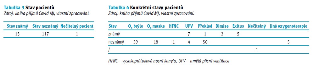 V tab. 3 a 4 jsou znázorněny následné stavy všech pacientů, kteří nezemřeli na HFNC či UPV terapii na Covid MJ JIP. Celkově bylo přeloženo 120 pacientů na různých podporách oxygenoterapie. Pacienty jsme rozdělili do dvou skupin, na skupinu známou a neznámou. Ve známé skupině byli ti pacienti, kteří byli stále monitorováni v klinickém informačním systému Metavision, a bylo tak možné zjistit jejich konečný stav. Ve skupině neznámé byli ti pacienti, kteří byli přeloženi na standardní oddělení nebo jiná covidová pracoviště, kde monitorování v systému Metavision dále neprobíhalo.