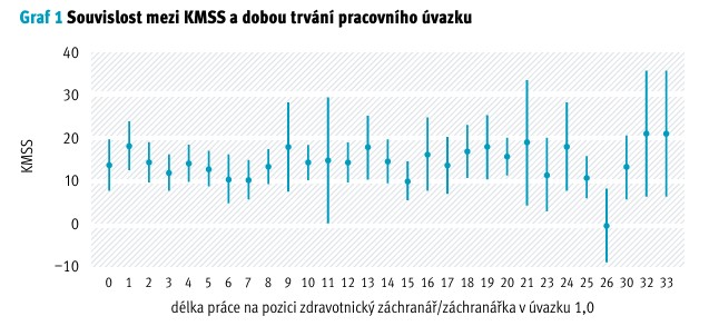 Základním zkoumaným parametrem studie byla celková spokojenost respondentů. Při zkoumání pracovní spokojenosti nelze opomenout zásadní proměnnou, kterou je doba trvání pracovního úvazku. Tato doba byla zjišťována u všech základních souborů dat, tedy KMSS, CBI-WB, BFI-N a PET, jako jeden ze základních parametrů, který může soubory dat ovlivňovat. Na grafu 1 je zobrazená spojitost spokojenosti v partnerském vztahu (KMSS) a době trvání pracovního úvazku. Výsledky ukazují zploštělou oscilační křivku spokojenosti s negativním peakem ve 26. roce trvání pracovního úvazku a následným vzestupem křivky k maximálním hodnotám zadaným respondenty. V datech nebyl zjištěn důvod poklesu oscilace ve 26. roce práce. Čím vyšší hodnota na ose Y, tím vyšší míra spokojenosti v partnerském vztahu.