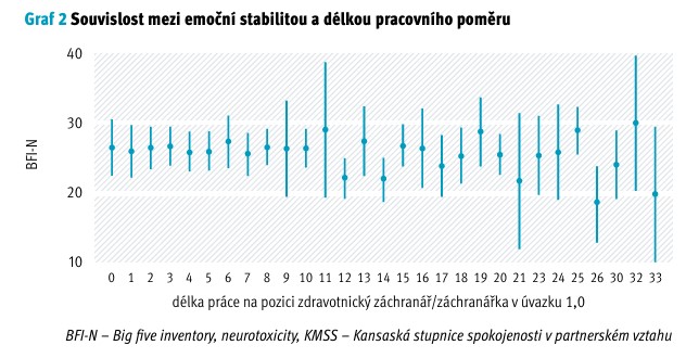 Zajímavá je závislost emoční stability (BFI-N) na délce práce v úvazku 1,0, která je vyjádřena grafem 2. Z tohoto grafu je patrné, že v letech 0–8 se emoční stabilita výrazně nemění a zůstává ve stabilních hodnotách, v letech 9–20 dochází k pozitivním i negativním výchylkám na ose Y a od 21. roku pozorujeme výrazné pozitivní i negativní odchýlení od spíše stabilních hodnot v prvních letech pracovního úvazku. V prvních letech práce zůstává na relativně stabilních hodnotách jak emoční stabilita, tak i spokojenost v partnerském vztahu, v dalších letech dochází u obou souborů dat k výchylkám, jak je patrné z grafu 1 a 2. Čím nižší hodnota na ose Y v grafu 2, tím vyšší míra emoční stability.