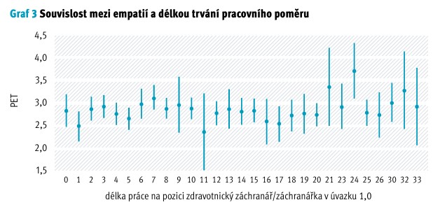 S délkou praxe se může měnit i míra empatie, která by se mohla snižovat i vzrůstat s počtem ošetřených pacientů. V grafu 3 můžeme vidět, že míra empatie (PET) v průběhu pracovního úvazku lehce osciluje a nejvyšších hodnot dosahuje okolo 24. roku praxe. Empatie tedy nekoresponduje s výsledky z grafů 1 a 2, kde byla patrná relativně stabilní zkoumaná hodnota v prvních letech praxe a následně se křivka měnila. U dat týkajících se empatie (PET) vidíme různé hodnoty i v prvních letech.