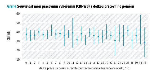 Podobně jako v grafu 1–3 bylo srovnáno i pracovní vyhoření (CBI-WB) v souvislosti s délkou trvání pracovního poměru a vyjádřeno grafem 4. Zde podobně jako u emoční stability a spokojenosti v partnerském vztahu můžeme pozorovat pouze minimální výchylky na ose Y v letech 0–8 a v následujících letech narůstá rozpětí křivky v pozitivním i negativním směru, avšak ne tak markantně jako u emoční stability. Grafy 1–4 tedy poskytují náhled do čtyř zkoumaných souborů dat se stejnou proměnnou a ukazují, že tři ze čtyř souborů dat se vyznačují relativně stabilní křivkou v prvních letech praxe.