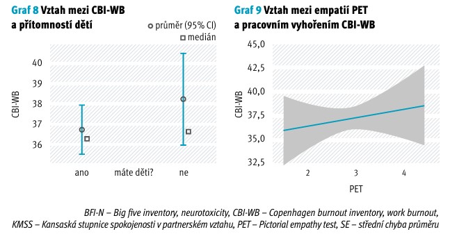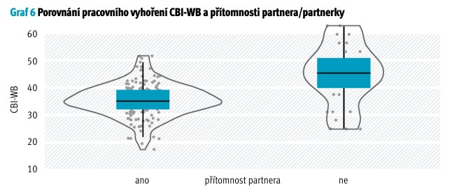 Studii zaměřenou na emoční stabilitu prezentovali Teng et al. (2009), kteří zkoumali míru stability u 263 zdravotních sester v letech 2007 a 2008. Studie prokázala, že emoční stabilita má výrazný dopad na pracovní spokojenost, a tím bezpečnost pacientů (p < 0,001). Nespereira-Campuzano et al. (2017) ve své studii zkoumali závislost emoční stability a stresu u zdravotníků na oddělení emergency. Studie se zúčastnilo 60 zdravotníků, syndrom vyhoření byl u respondentů středně vysoký a signifikantní korelace byla nalezena mezi pracovní spokojeností a emočním stavem (R = 0,276; p = 0,033). V námi prezentovaném výzkumu bylo současně prokázáno, že respondenti, kteří mají partnera, mají signifikantně menší riziko rozvoje pracovního vyhoření (graf 6), přičemž byla prokázána lineární závislost proměnných (p < 0,001). Spokojenost v partnerském vztahu je prediktorem nižší míry pracovního vyhoření, avšak nebyl nalezen statisticky významný rozdíl v CBI-WB mezi skupinami respondentů s dětmi a bez dětí. Podobným problémem se zabývali i autoři Kocalevent et al. (2022) ve výzkumu zaměřeném na propojenost partnerského života a pracovního stresu u lékařů. Výzkum byl veden v roce 2016 a byly využity standardizované dotazníky ERI (Effort-reward imbalance) a MBI. Výzkum přinesl výsledky v podobě signifikantního efektu přítomnosti partnera ve vztahu k pracovnímu stresu.