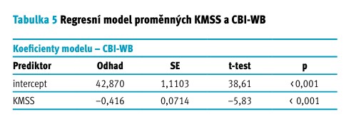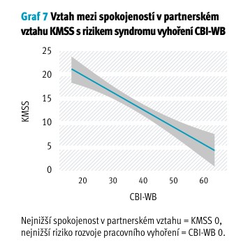 Dále byla zjištěna závislost mezi spokojeností v partnerském vztahu a pracovním vyhořením, vyjádřená grafem 7. Z výsledků je patrné, že respondenti, kteří vedou spokojený partnerský vztah, mají výrazně nižší míru rizika pracovního vyhoření a že s klesající spokojeností v partnerském vztahu se zvyšuje míra pracovního vyhoření. V tab. 5 je patrná lineární závislost proměnných KMSS a CBI-WB, p < 0,001. Pearsonův korelační koeficient je R = –0,381, vztah proměnných je poměrně silný.