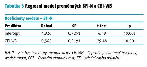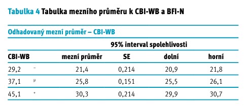 Pro potvrzení hypotézy 1, tedy zda existuje vztah mezi emoční stabilitou a syndromem vyhoření, byl využit graf lineární regrese (graf 5). V tab. 3 je patrné, že proměnná BFI-N lineárně závisí na proměnné CBI-WB, p < 0,001. Vztah proměnných je poměrně silný, protože výběrový odhad Pearsonova korelačního koeficientu je R = 0,902. Doplněna byla tab. 4, tabulka mezního průměru, ukazující, že čím nižší je emoční stabilita respondentů (BFI-N), tím vyšší je riziko rozvoje syndromu vyhoření ve vztahu k pracovnímu prostředí (CBI-WB). Hypotéza 1 byla potvrzena, existuje souvislost mezi emoční stabilitou a rizikem rozvoje syndromu vyhoření.
